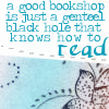 Description: Text reads "A good bookshop is just a genteel black hole that knows how to read"